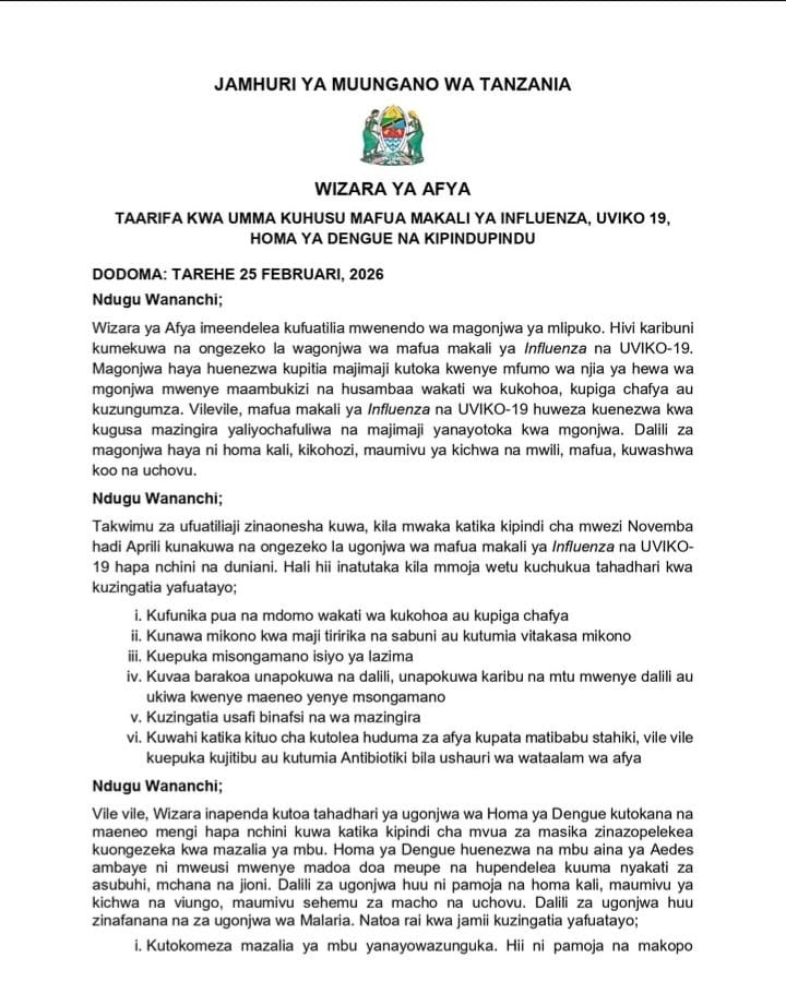 Kwa mujibu wa taarifa hiyo, Wizara ya Afya imebaini ongezeko la wagonjwa wa mafua makali ya influenza na UVIKO-19 katika maeneo mbalimbali.
