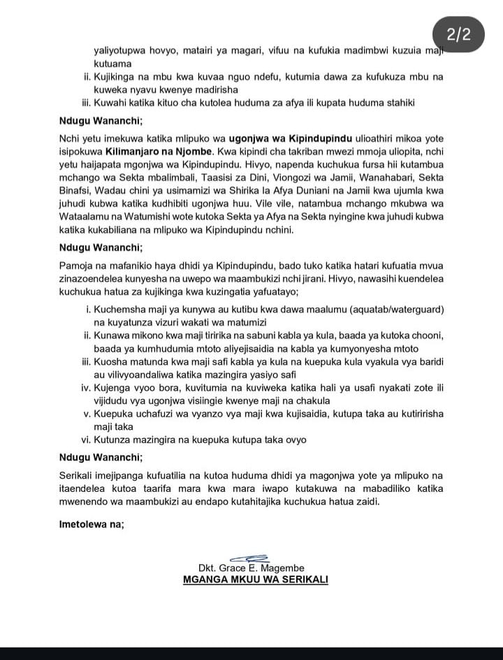 Iliwasihi wananchi kuendelea kuchukua tahadhari kwa kuchemsha maji ya kunywa au kuyatibu kwa dawa maalumu kama aquatab au waterguard, kunawa mikono kwa maji tiririka na sabuni katika nyakati muhimu, kuosha matunda kwa maji safi kabla ya kula na kuepuka vyakula vilivyoandaliwa katika mazingira yasiyo safi.
